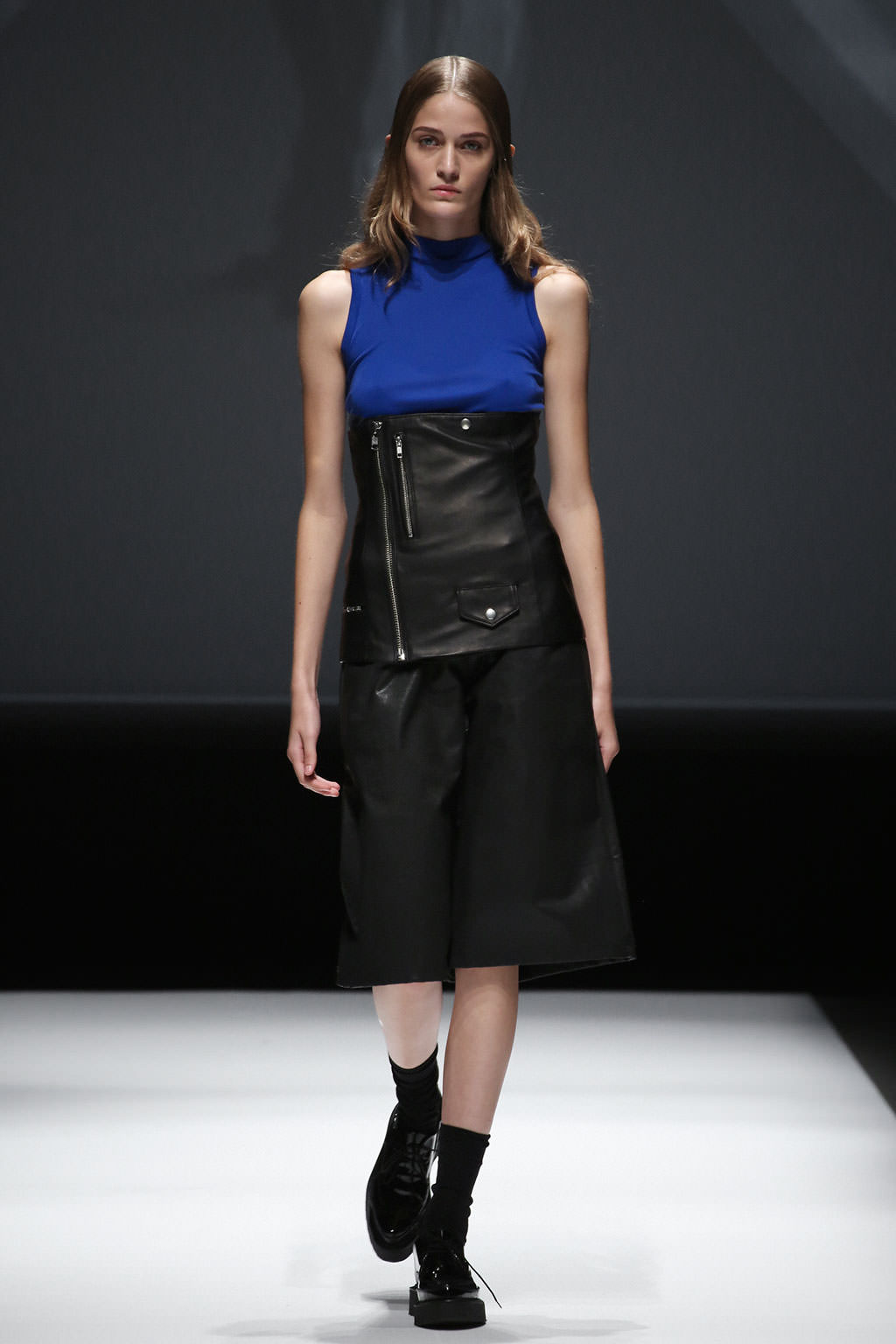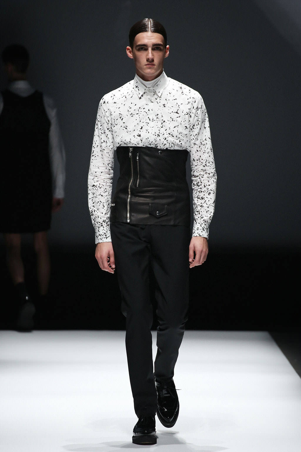 男女ともに体のラインが美しく見え、無駄のない洗練された空気感を感じさせる。ウエスト辺りに着用しているコルセットのようなレザーのアイテムは黒のボトムスと合わせればシルエットづくりに悩ませることもないだろう。はっきりとした色合いの中に混沌さを生み出すデザインは非常に魅力的だ。