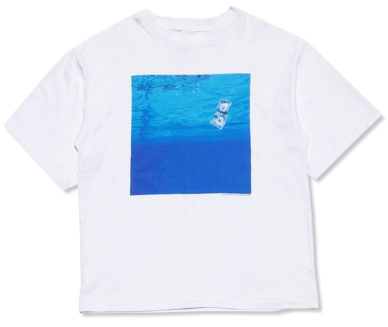 3枚目は、一見普通のバンドTシャツに見えるこちらのアイテム。しかし見慣れたものとは何かが違う。”NO MORE HEROS”と題された、これはあのバンドやこのバンドの名作ジャケットから、「主体がいなくなったらどうなるか?」というところから着想されているのシリーズ。情報が複雑に入り混じる現代の中で、もっとシンプルに考えようぜ、というデザイナーの思いも裏に潜んでいる。ボディはヴィンテージの風合いを丁寧に再現したこだわりの逸品で、フェスですれ違う一部の同じ共通言語をもつ人々から注目を集めるに違いない。もしかしたらこの一着から新しいコミュニケーションが生まれることもあるかも。