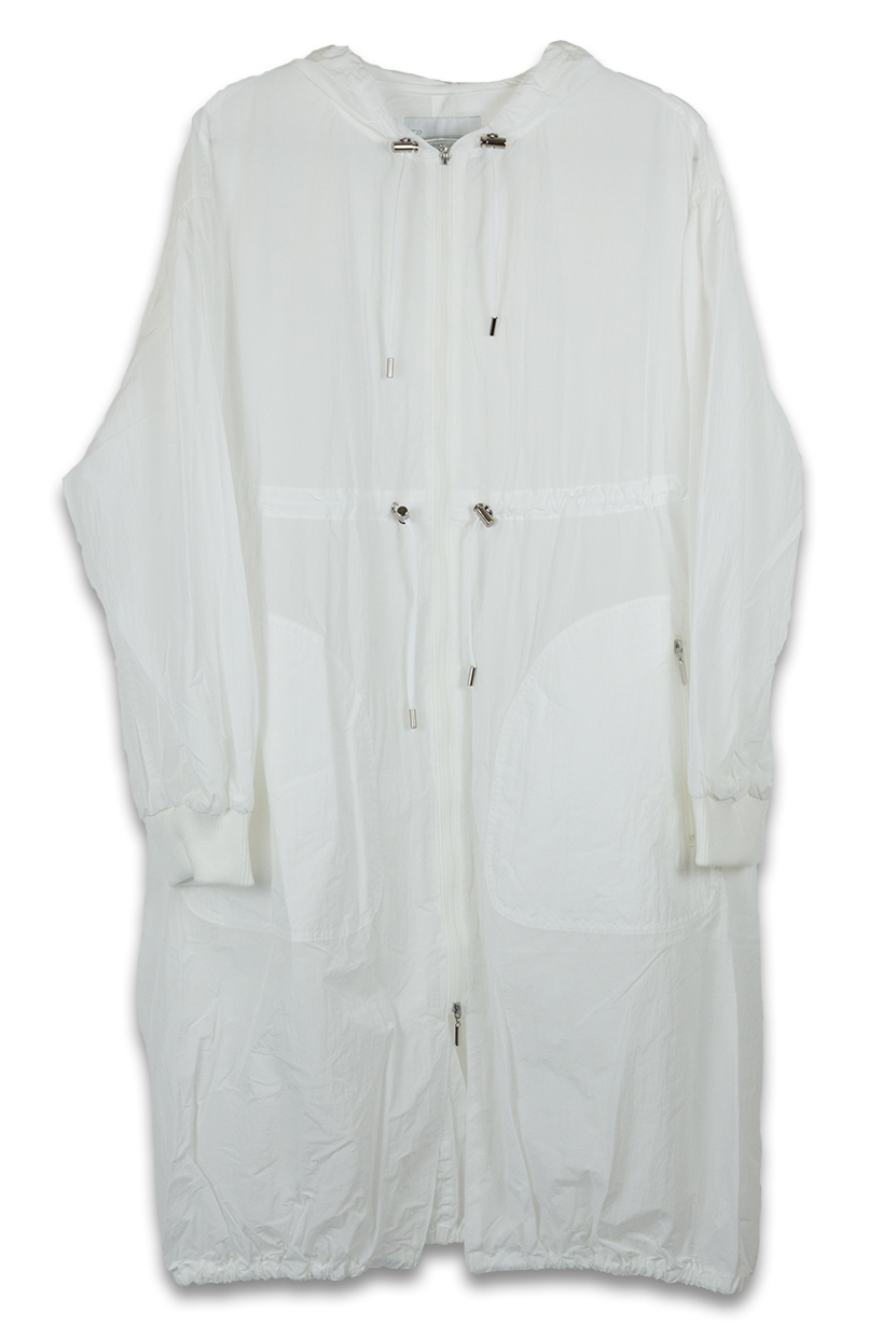 続いてはレインコートをベースにしたこちらのアイテム。軽量さを重視した作りで、持ち運びにもぴったり。2箇所のドローストリングでシルエットを自分好みに変更できる。基本的にはレディース向けに作られてはいるものの、オーバーサイズのためメンズでも十分に着られるようになっている。