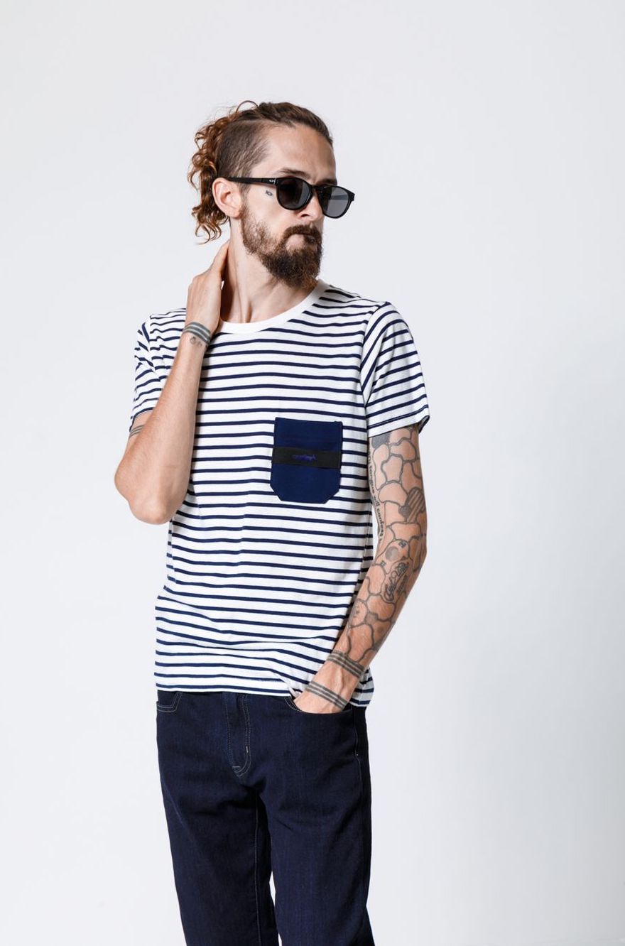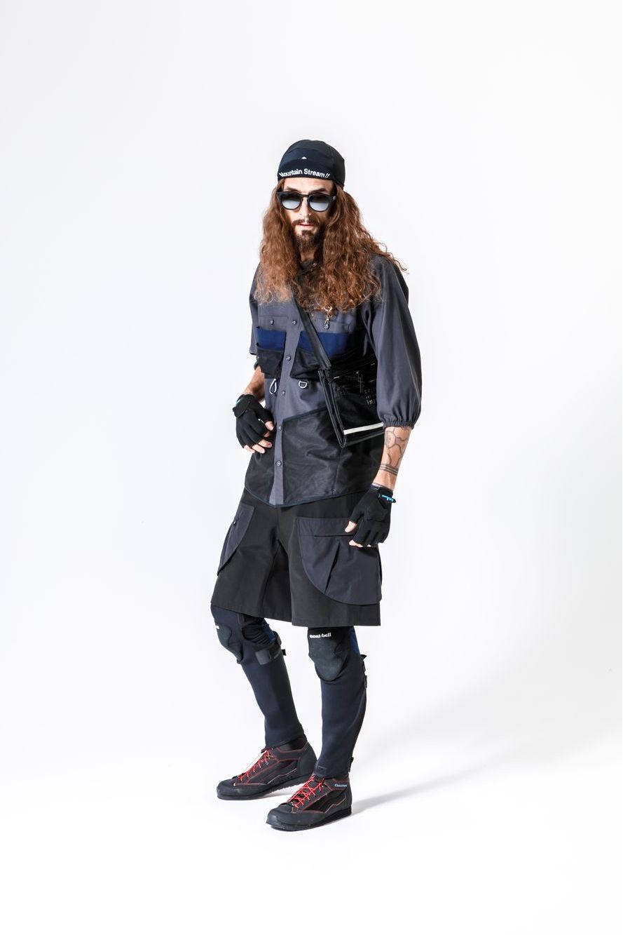 次に紹介するのはこれも定番中の定番であるボーダーTシャツ。ただこのアイテムの特筆すべき点として、さりげなく、ポケット部分にフィッシングのディテールを落とし込んであったり、首回りにバインダー処理がされていたりと、見た目のワンポイントと、タフなアウトドア環境に配慮がされているところが心憎い。デザイナー自身が日々実践する、群馬県みなかみで夏はフィッシング、冬はスノーボードという本格的なアウトドアライフからインスパイアされたデザインは、数多の「フェス・ボーダーT被り」の中から一際本格派のオーラを醸し出すに違いない。
