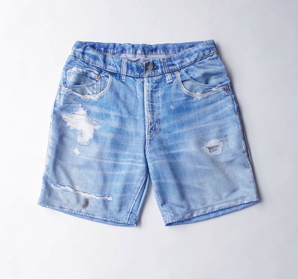 お次は、一見デニムショーツにしか見えないこの逸品。実はポリエステルの生地に精巧に転写されたもの。本物のヴィンテージアイテムを元に、3Dの立体的な転写データを作成し高い印刷技術を用いた他ではお目にかかれないアイテムだ。素材にはCOOL MAXと呼ばれる速乾性と優れた通気性を実現する最先端の素材を用いており機能性は抜群。ヴィンテージデニムを履きたいけれど、重いし暑いし汗で濡れたりするのは嫌、というわがままな要望にもひと笑みでさらりと応えてくれる。
