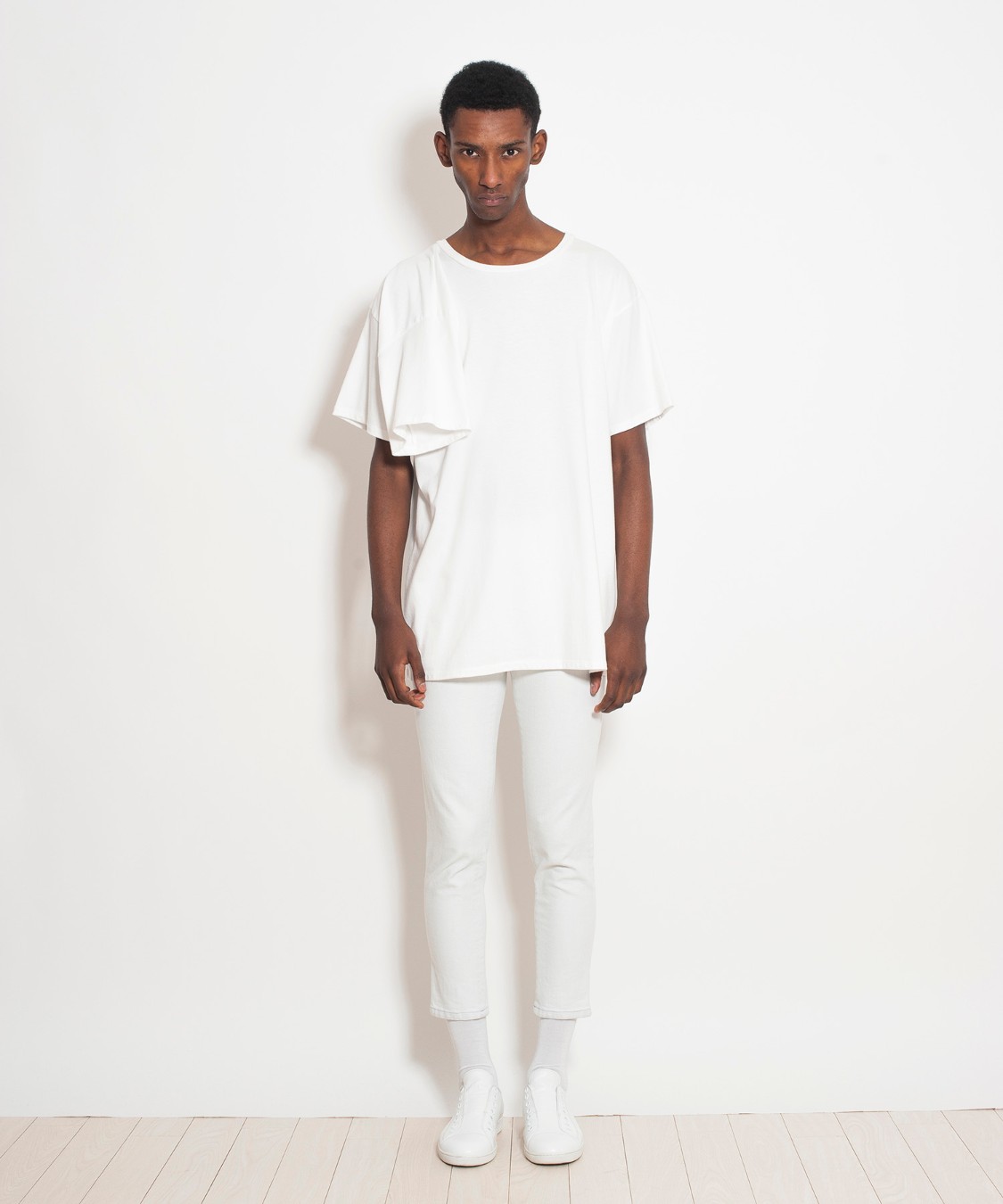 まずはすでに定番ともなった“白Tシャツ”の進化版とも言えるこのアイテム。 一見ただのTシャツに見えるが、実は袖が4枚ついているのだ(!)袖をどちらにも通せるようになっているから、アシンメトリーにしたり、両袖を前、後ろにしたりと、着る人がスタイルを選べるところも嬉しい。シンプルなアイテムでも他の人とは被りたくない、そんな思いを叶えてくれるアイテムだ。