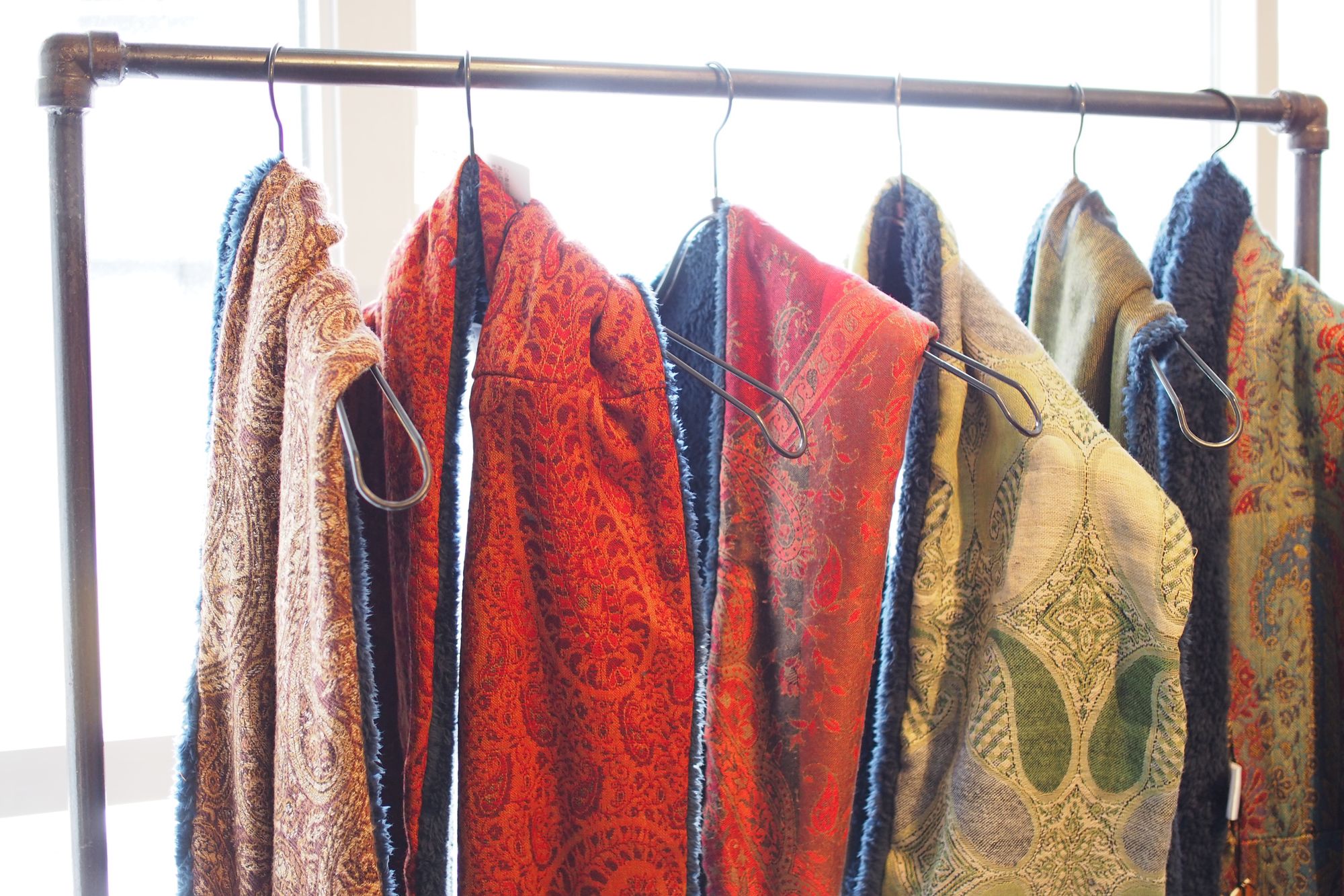 転写アイテム以外にも、先ほどの伝統的な工場との取り組みで、蚊帳生地を染め、縮絨加工したウエア、リメイクウエアなど、幅広いラインナップに仕上げました。