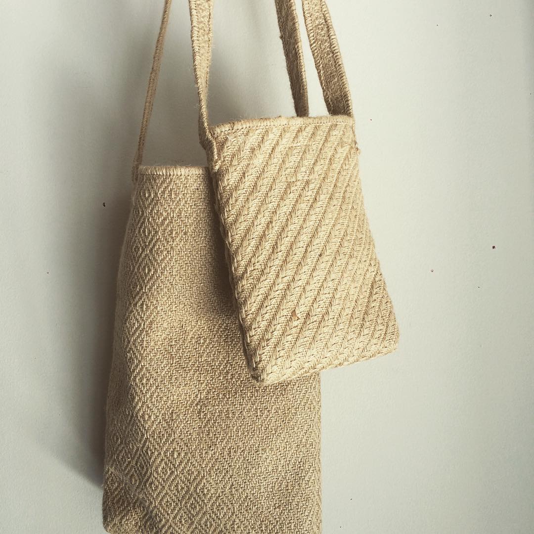 ベーシックなデザインながら、蚊帳生地を染めたストールや、ジュート素材やパナマ生地でバッグを製作するなど、初の試みのアイテムが並びます。
