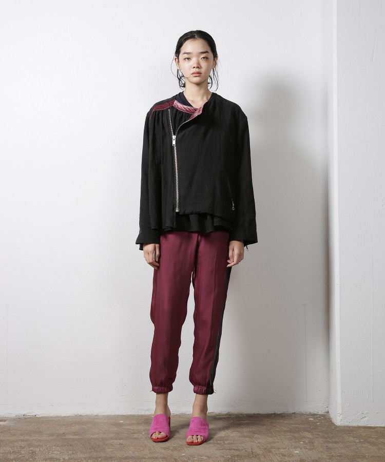 2つ目はRe:LIGHTのテーマを象徴する素材・サテンを使ったシリーズ。透け感と光沢が楽しめます。花柄のスカートとミックスしたローブや、トラックパンツ、天竺生地と切り替えたカットソーなど充実しています。