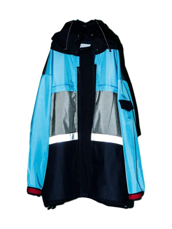 様々な3レイヤー生地を使用したマウンテンパーカ。いろいろな場所にポケットが沢山ついています。フードは取り外し可能。